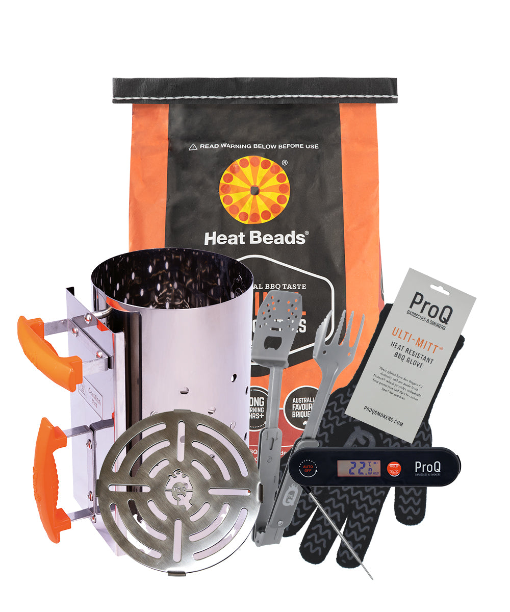 Includes a ProQ Stainless Steel Charcoal Chimney Starter, a ProQ Afterburner Grill, a ProQ Travel BBQ Multi-Tool, a ProQ Ulti-Mitt BBQ Glove, a ProQ Digital Instant Read Thermometer, and a 4kg bag of Heat Beads® Briquettes!