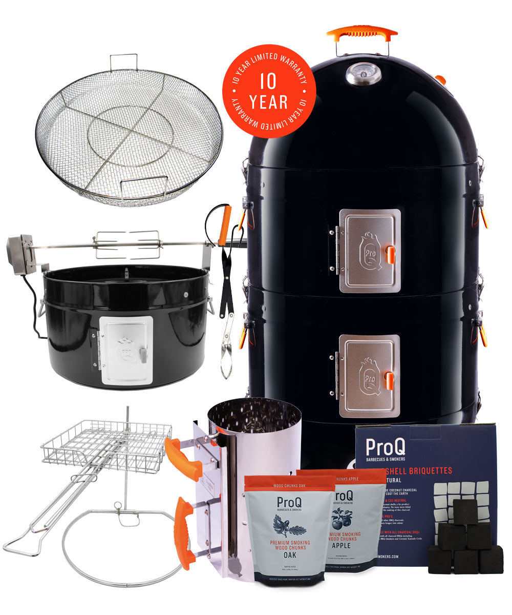 Includes a ProQ BBQ Smoker (Frontier or Excel), with all the gear, plus everything you need for cold smoking, plus a long list of BBQ & cold smoking goodies, please see the "What's in the Box" tab below for a full list!